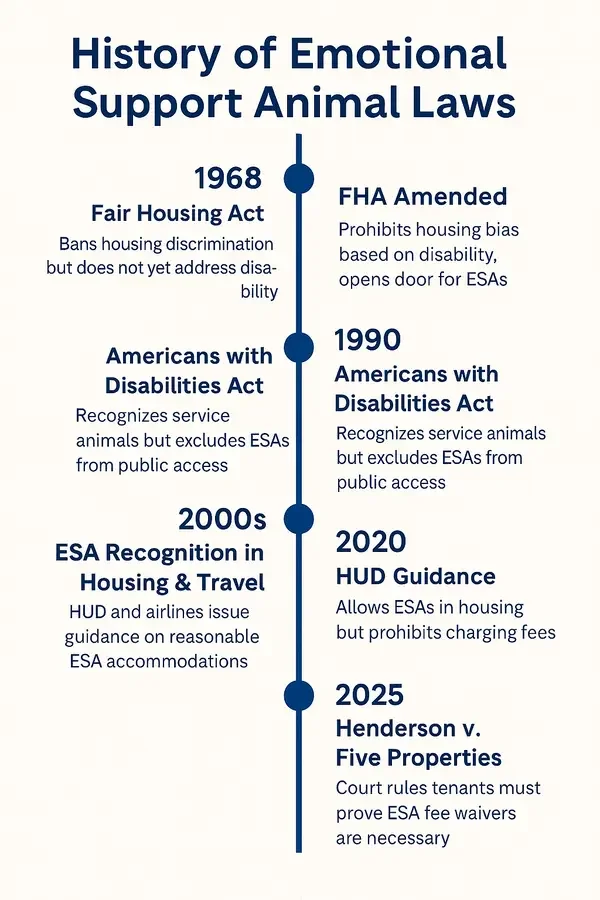 HUD released a notice affirming landlords cannot charge fees for ESAs, but landlords retained the right to request documentation.2025: Henderson v. Five Properties